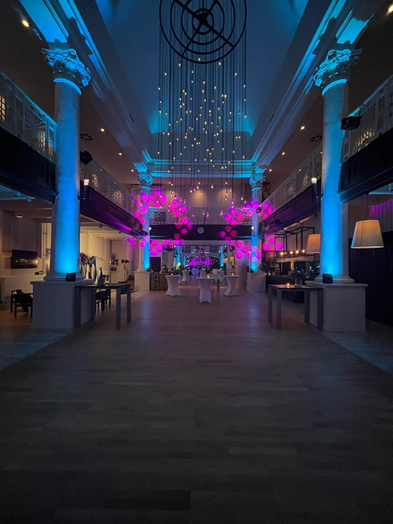 De feestzaal is gevestigd in het voormalige synagogegebouw uit 1865 en ademt historie en karakter. Zodra je binnenkomt, valt je oog op de indrukwekkende kroonluchter van architect Abe Bonnema, die direct zorgt voor een magische sfeer. Dankzij de ruime dansvloer en de galerie op de eerste verdieping, waar je prachtig uitkijkt over de zaal, voelt ieder feest hier groots en stijlvol aan.